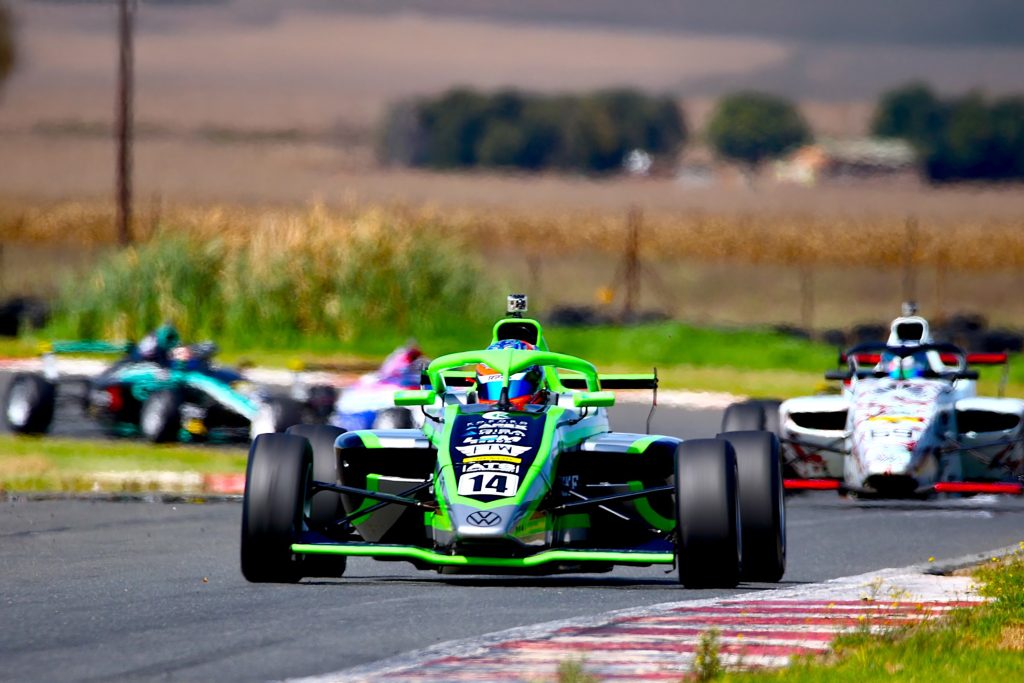Former British Formula 4 star Aqil Alibhai turned the Dunlop shod Investchem MSA4 chase on its head after pole man Shrien Naidoo bogged at the start. That left Mikel Bezuidenhout to chase Alibhai home with Karabo Malemela, Guido Bidoli and Naidoo in chase. Alibhai made race 2 his own too, after Naidoo clashed with Bezuidenhout, who held on for second. Malemela was third from Bidoli and Kent Swartz. That sees Alibhai into the championship lead, 7 points clear of Bezuidenhout, Malema and Naidoo.