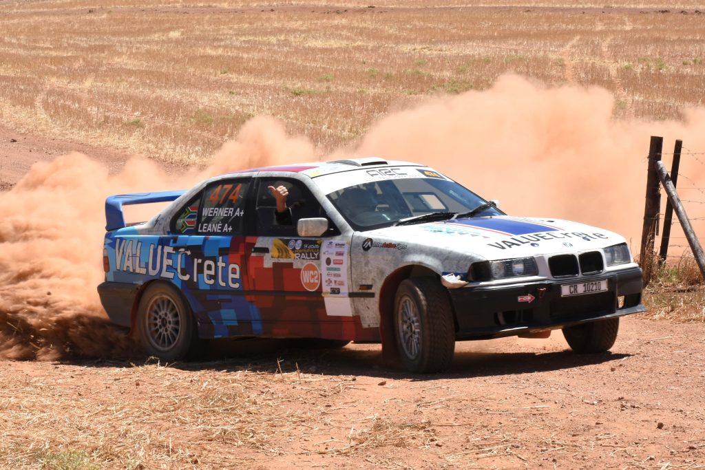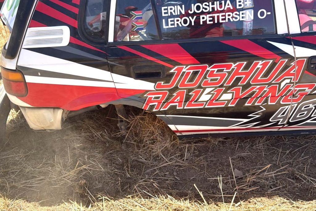 Owen Jones en Aden Bredekamp haal die einde van die trajek met ‘n sy-as problem op die #454 CPMCC WC1 Somerset Wes Subaru Impeza 2.0 Turbo 4×4 en skielik is dit Werner en Leané Koekemoer wat ‘n twee sekonde voorsprong geniet in die #474 CPMCC WC1 Valuecrete BMW E36 3.2! Keenan Sassman en Carl Peskin nou slegs 15 sekondes stadiger as Jones in die derde plek met die #413 CPMCC WC1 Howard Centre Motors Workshop Subaru Impreza 2.0 Turbo 4×4. Paul van Wyk en Herman Mathee het nou begin moeg word want die #469 CPMCC WC1 acciDent Guru Audi S3 1.8 Turbo Quattro was nog sterk vyfde.