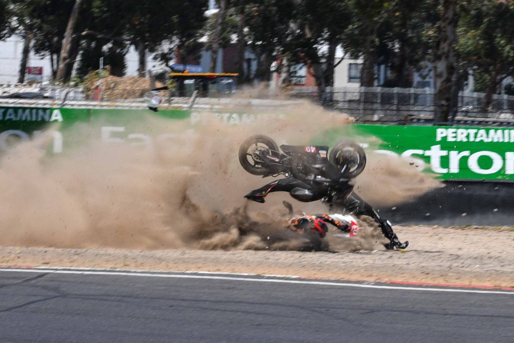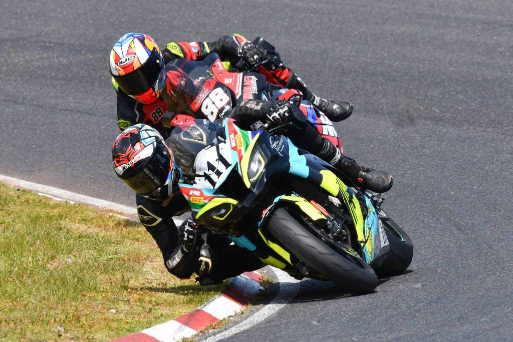 Samkelo Liwani (Ezilifu #49 Yamaha -R1) en Ethan Diener (The Mag Workshop #3 Yamaha R6) baie gelukkig om met slegs lyfseer op te staan na ‘n baie skouspelagtige insident in Pertamina Fastron (Draai 5).