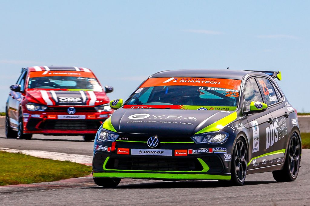 Hannes Scheepers continued unbeaten in the Astron Energy Polo Cup by twice passing pole man Charl Smalberger off the start to score a double victory. Roshaan Goodman held Mauro Da Luz off for third with Shiren Rajpaul and Jayden Goosen in chase. Wayne Masters won Polo Masters from Derick Smalberger and John Kruger. Charl Smalberger tried every trick in the book to pass defensive Scheepers in an enthralling second race, where Goodman held Goosen and Da Luz off and Masters again beat Smalberger and Kruger to the Masters win.