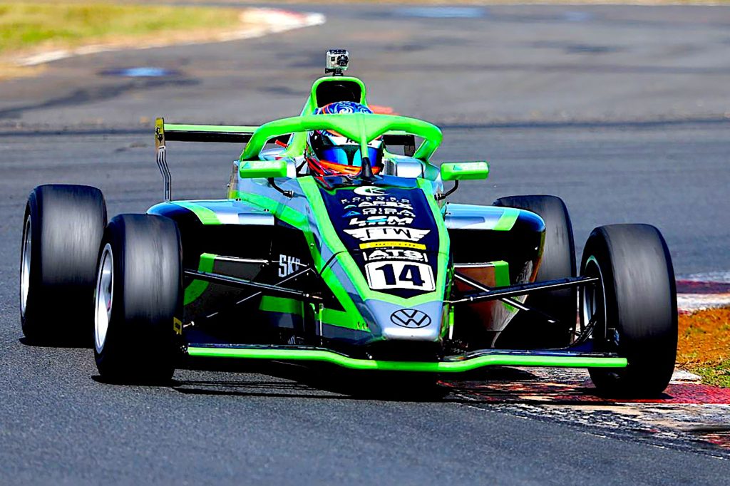 Chase Haskins followed in seventh from Polome, Fourie and Anastasia Gerasis in tenth, Kajee, Mohlahlo and a delayed Gianna Pascoal as Kent Swartz joined Khoza in retirement. Ian Schofield utterly dominated the Kent action from Vos, Morris, and van Weely. With the race 2 grid taken of drivers’ second best qualifying times, Shrien Naidoo started on pole from Aqil Alibhai and Mikel Bezuidenhout.