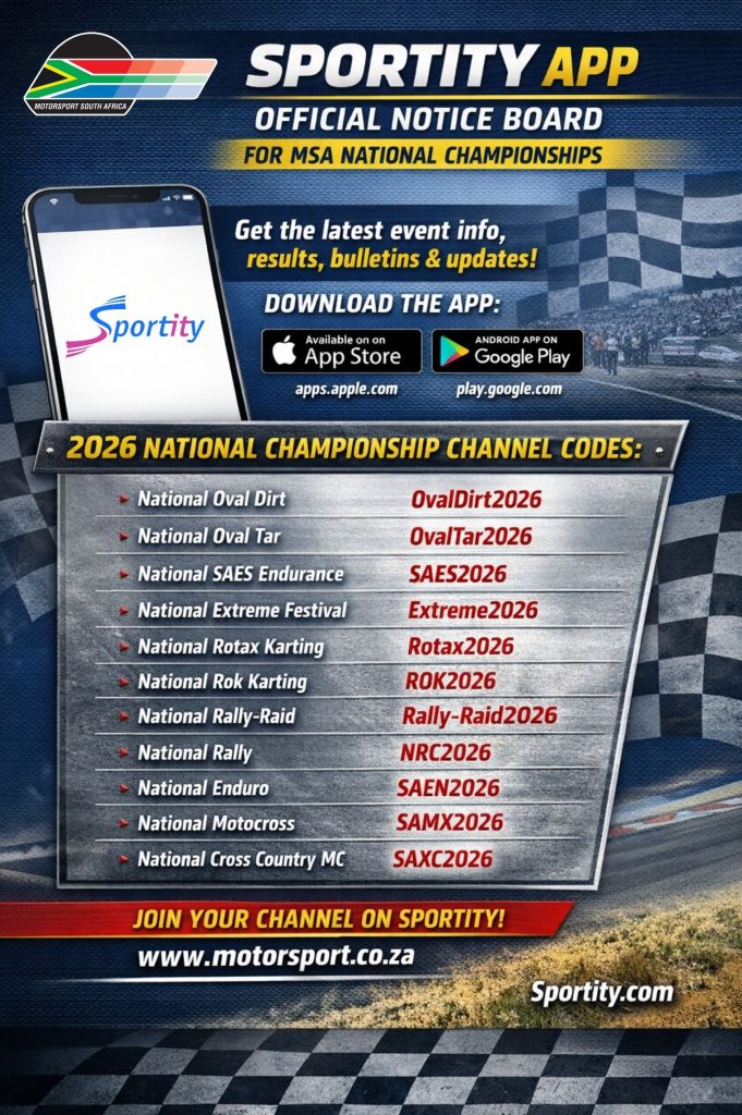 Motorsport South Africa (MSA) wishes to remind all competitors, teams, officials, media and spectators that the Sportity mobile application serves as the official digital notice board for all MSA National Championship events.