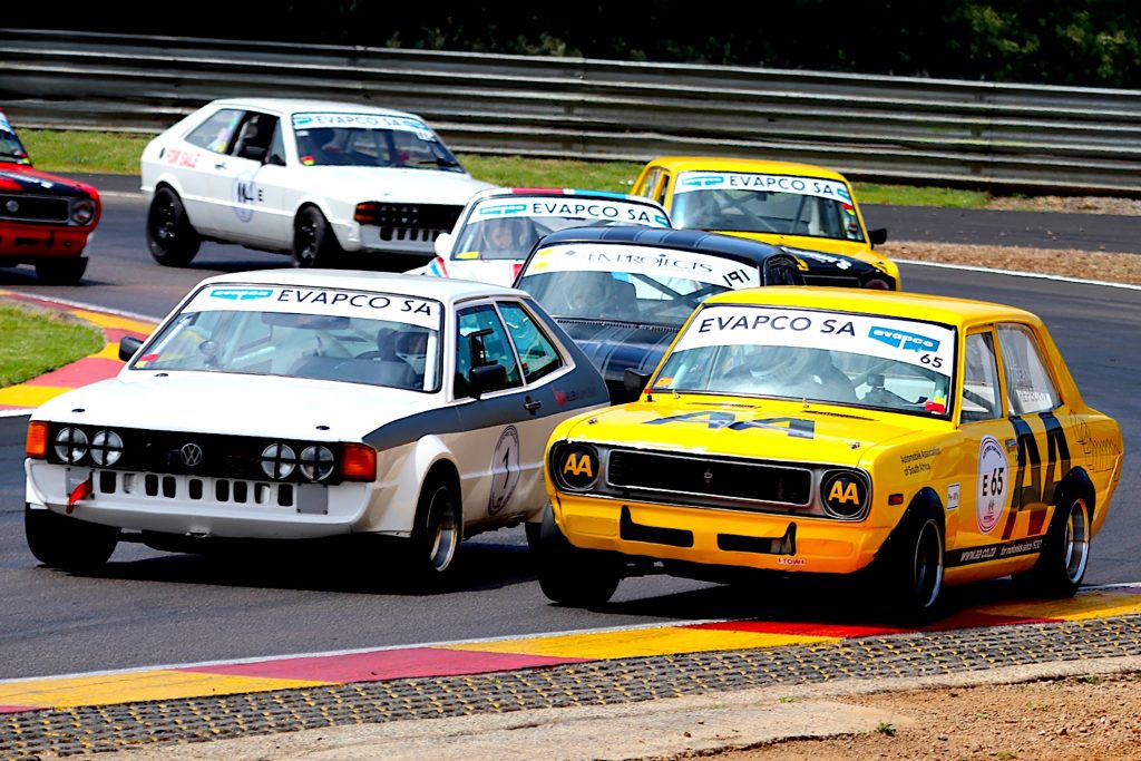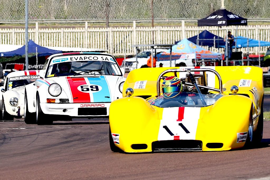 Keegan Campos continued his winning ways in the Evapco HRSA sprint in his Porsche 911 RSR from Class C winner Werner Kotze’s Mazda R100. Andre van der Merwe was third in another RSR from Andre ten Napel’s Class C Scirocco, Rudolf de Vos B Chevy Firenza Can Am and D winner Jannie van Rooyen’s Scirocco. Seef Fourie’s Datsun 140Y took Class E while David Armstrong’s BMW beat Mike O’Sullivan’s Ballade to Historic Touring Car honours.