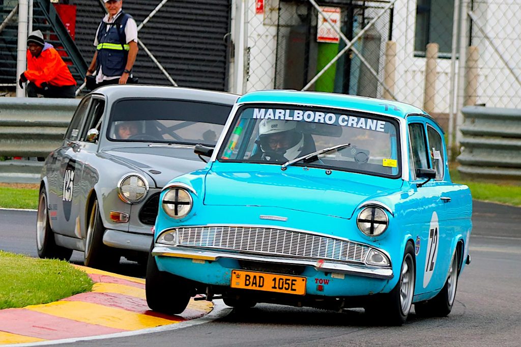 Zimbabwean Denzil Bhana’s Ford Anglia beat Alan Poulter and his Volvo 122s to the opening Legends Little Giants win. Alfa Romeo Giulia trio, Super men Marc Miller,Roger Houston, and Francesco Lombardi’s Sprint GT followed from GSM father and son, John’s Dart and Chad ten Doeschate’s Flamingo. Bhana beat Poulter and Miller again in race 2 from Lombardi, Carel Pienaar’s Lotus Cortina and John and Chad ten Doeschate.